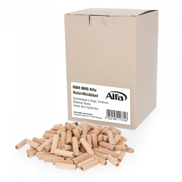 Les chevilles en bois Alfa 6604 sont des aides pratiques lors de l'assemblage de meubles en bois. Elles sont idéales pour assembler rapidement, de manière stable et sûre, des panneaux et du bois massif. Les chevilles en bois sont en bois de hêtre, sont chanfreinées aux deux extrémités et sont simplement collées dans les trous et maintenues par un serre-joint à vis.